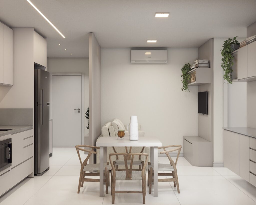 Em apartamentos compactos, a organização é fundamental para evitar o caos. Um projeto bem elaborado prevê espaços específicos para cada item, desde armários planejados até soluções para guardar objetos menores. Isso não apenas facilita a rotina, mas também contribui para um ambiente mais clean e livre de distrações visuais, promovendo o bem-estar e a tranquilidade.