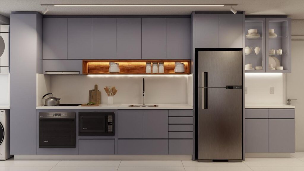 As superfícies claras e os acabamentos que remetem à madeira náutica trazem leveza visual e a durabilidade necessárias para um ambiente que estará em contato com a maresia.
