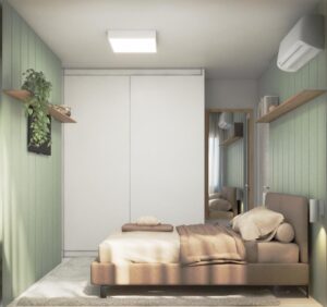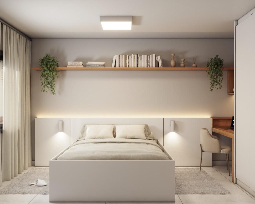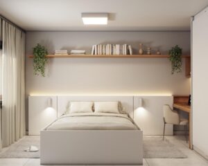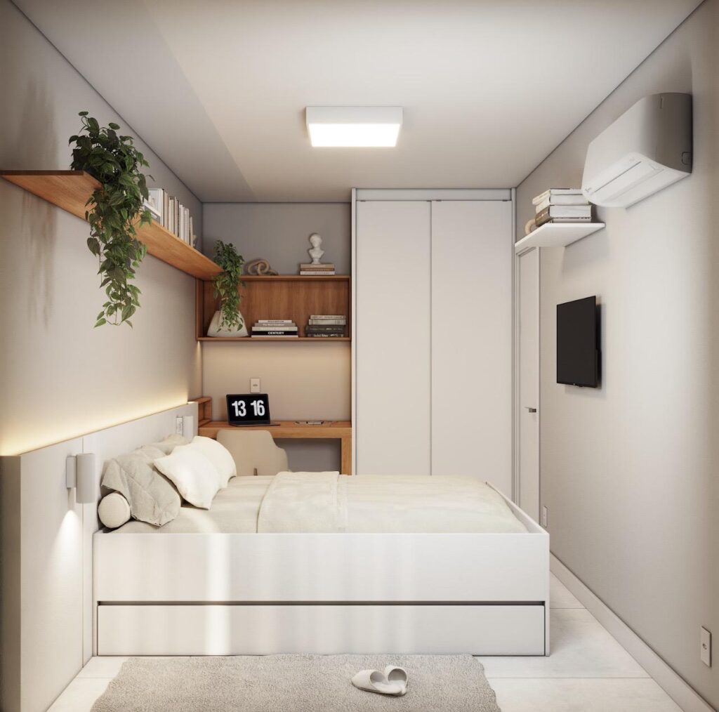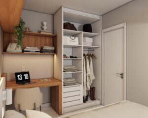 É aqui que a magia acontece! Armários embutidos que desaparecem nas paredes, estantes que se encaixam perfeitamente em nichos e camas com gavetões integrados são apenas alguns exemplos de como a marcenaria planejada otimiza cada centímetro.